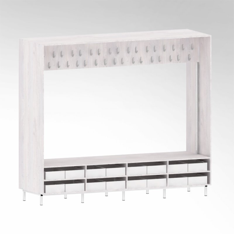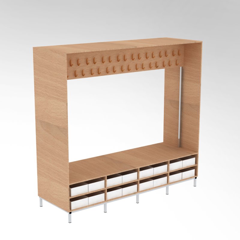Стойка гардеробная состоит из двухсторонних вешалок, мест для сидения и хранения обуви.