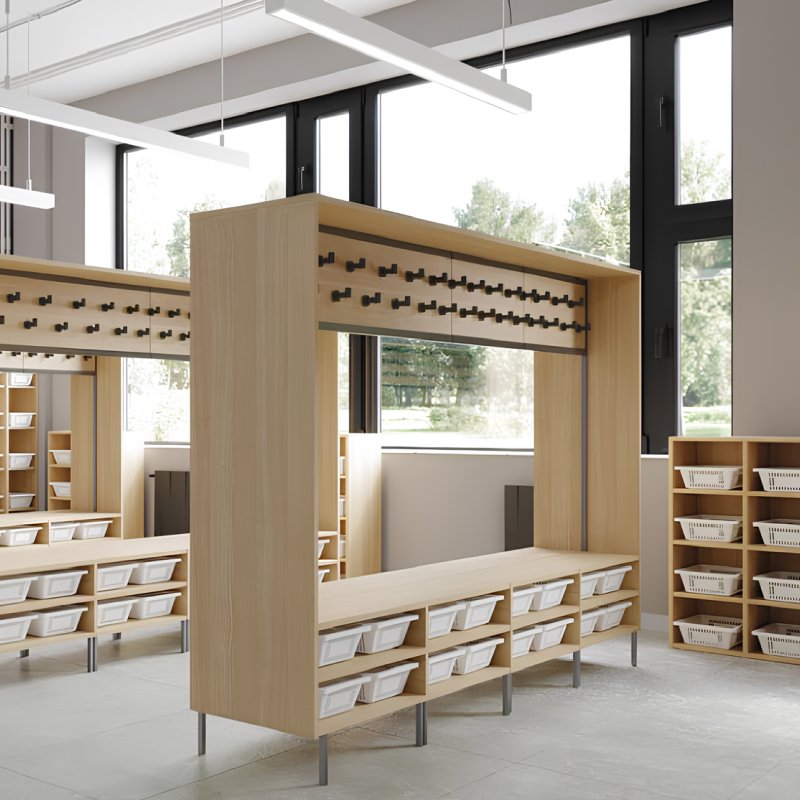 В основании вешалок располагаются места для сидения и ниши под обувь.