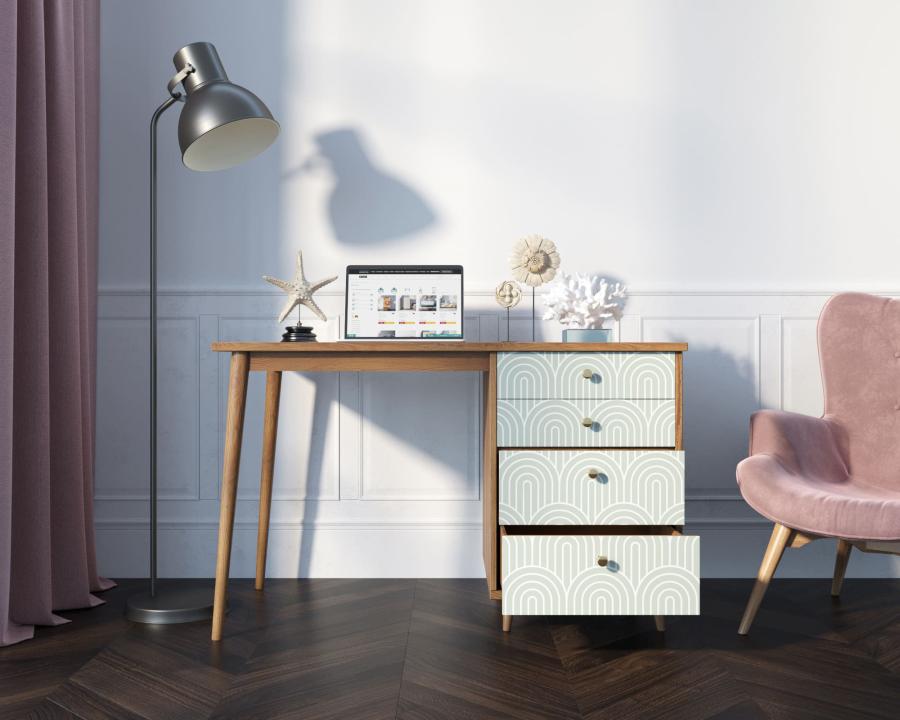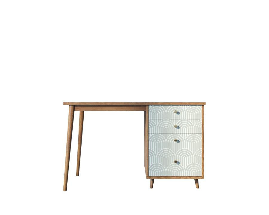 Рабочий стол "Berber" имеет четыре ящика на шариковых направляющих, цельное подстолье из натурального ясеня для улучшения устойчивости и дизайнерский принт на фасаде, который можно заменить по вашему желанию.