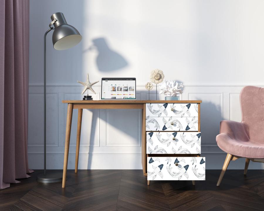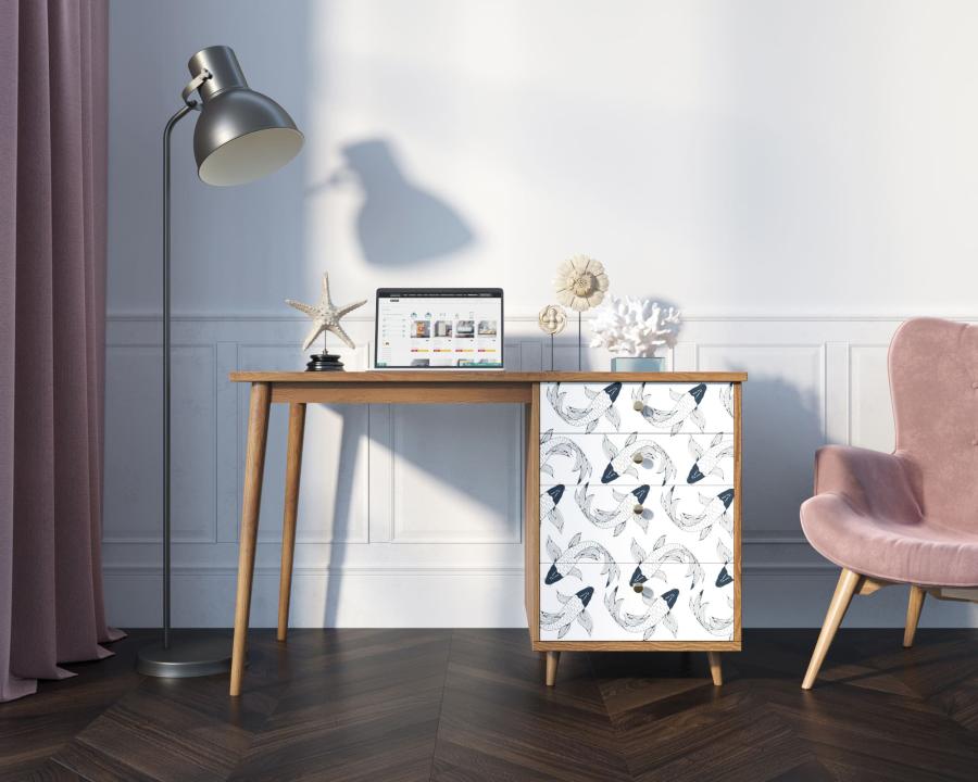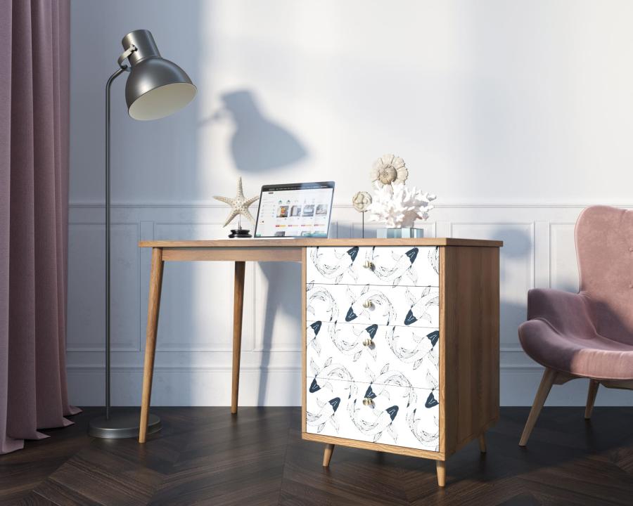 Рабочий стол "Berber" имеет четыре ящика на шариковых направляющих, цельное подстолье из натурального ясеня для улучшения устойчивости и дизайнерский принт на фасаде, который можно заменить по вашему желанию.