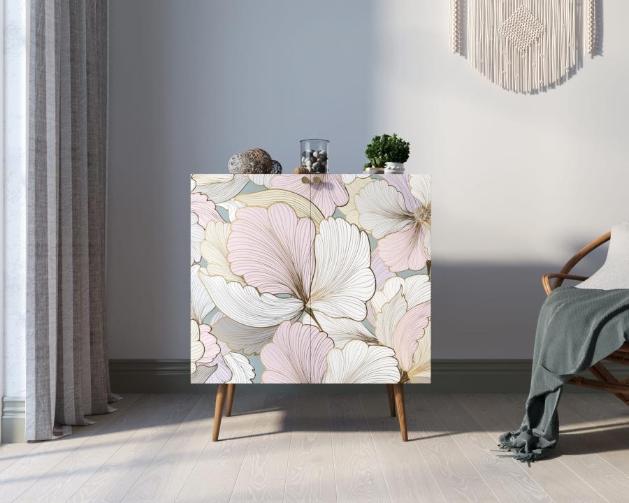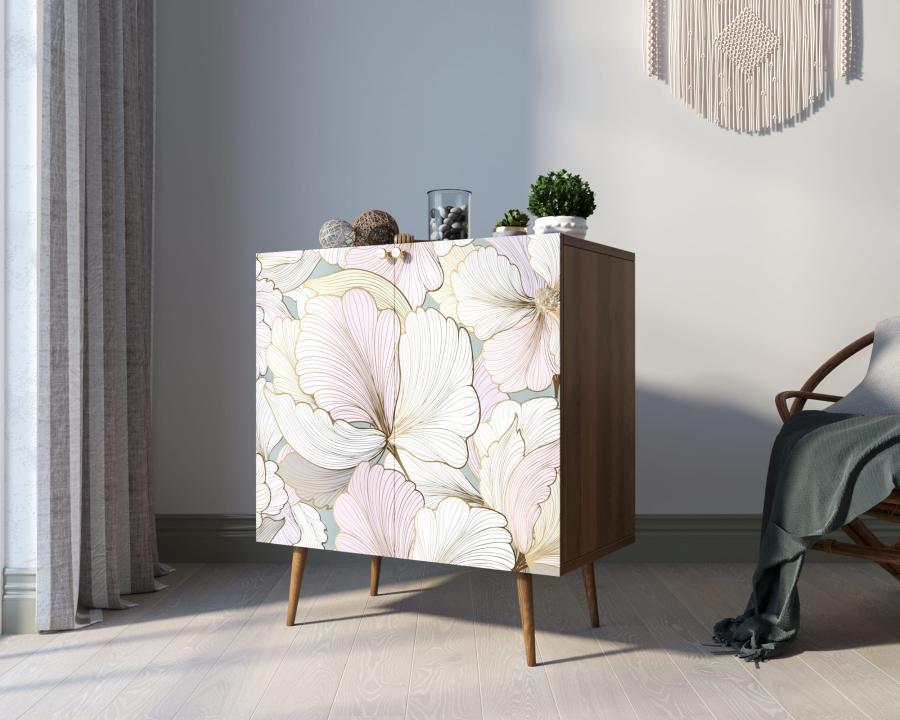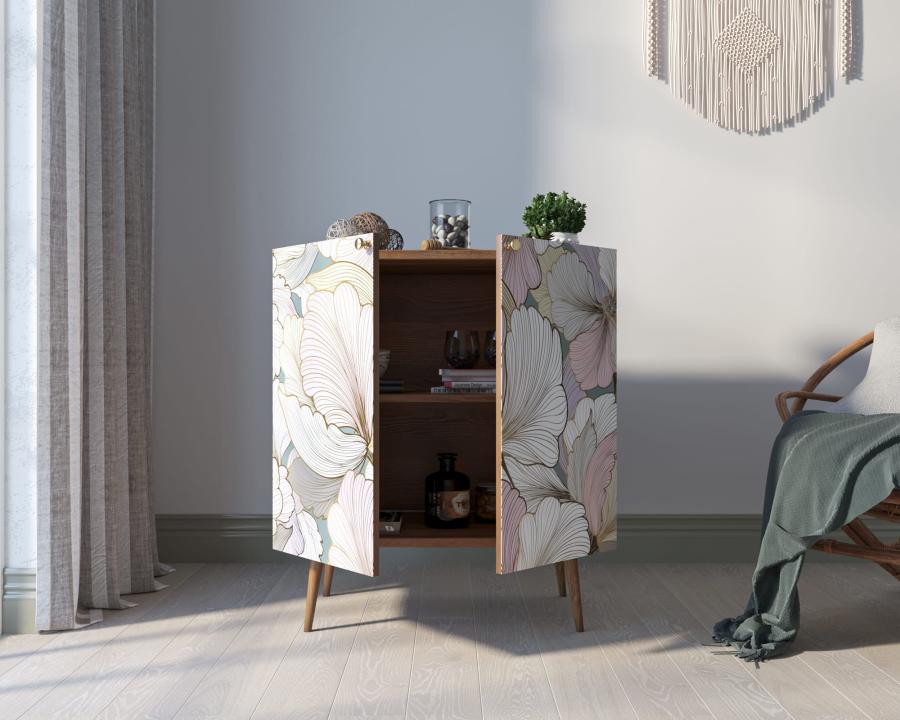 Компактная модель комода скрывает за дверками нишу, разделенную на две части полкой регулируемой по высоте. Корпус прямоугольной формы, а ножки изготовлены из прочного массива ясеня. Комод привлекает внимание спокойным принтом на фасаде.