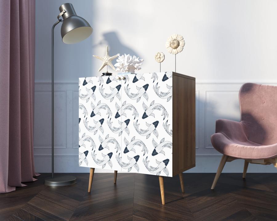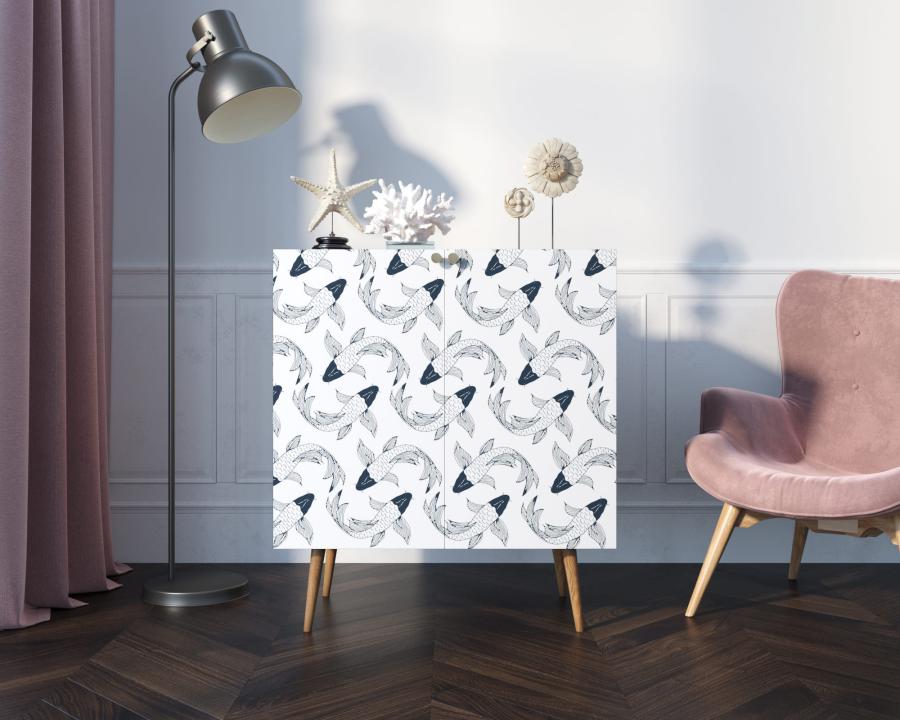 Компактная модель комода скрывает за дверками нишу, разделенную на две части полкой регулируемой по высоте. Корпус прямоугольной формы, а ножки изготовлены из прочного массива ясеня. Комод привлекает внимание спокойным принтом на фасаде.