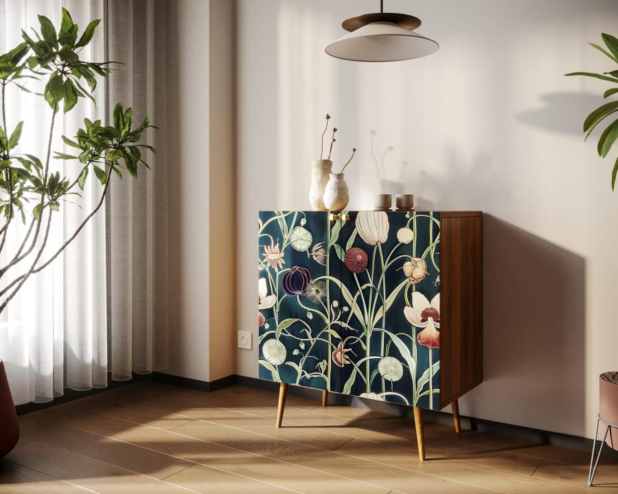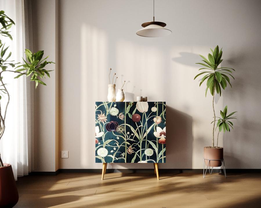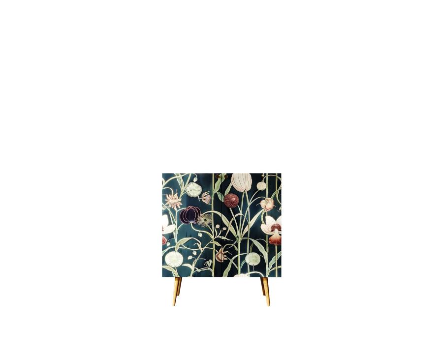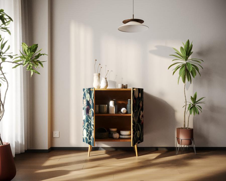 Компактная модель комода скрывает за дверками нишу, разделенную на две части полкой регулируемой по высоте. Корпус прямоугольной формы, а ножки изготовлены из прочного массива ясеня. Комод привлекает внимание спокойным принтом на фасаде.