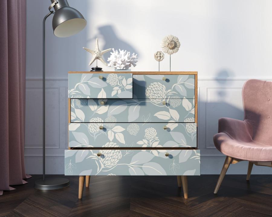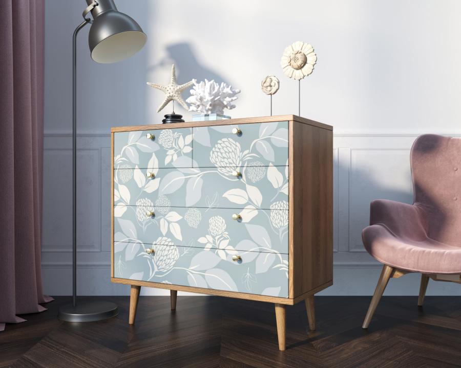 Компактная модель комода представлена ​​пятью продольными ящиками с удобными ручками. Корпус прямоугольной формы выполнен, а ножки изготовлены из прочного массива ясеня. Комод привлекает внимание спокойным принтом на фасаде.