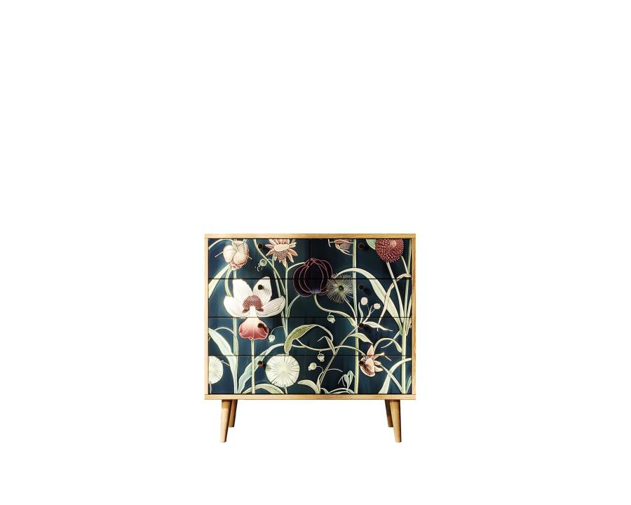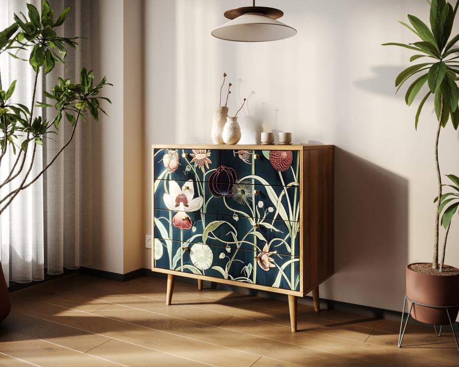 Компактная модель комода представлена пятью продольными ящиками с удобными ручками. Корпус прямоугольной формы выполнен из ЛДСП, а ножки изготовлены на основе натурального дерева. Комод привлекает внимание спокойным принтом на фасаде.