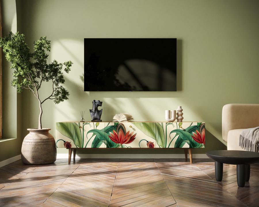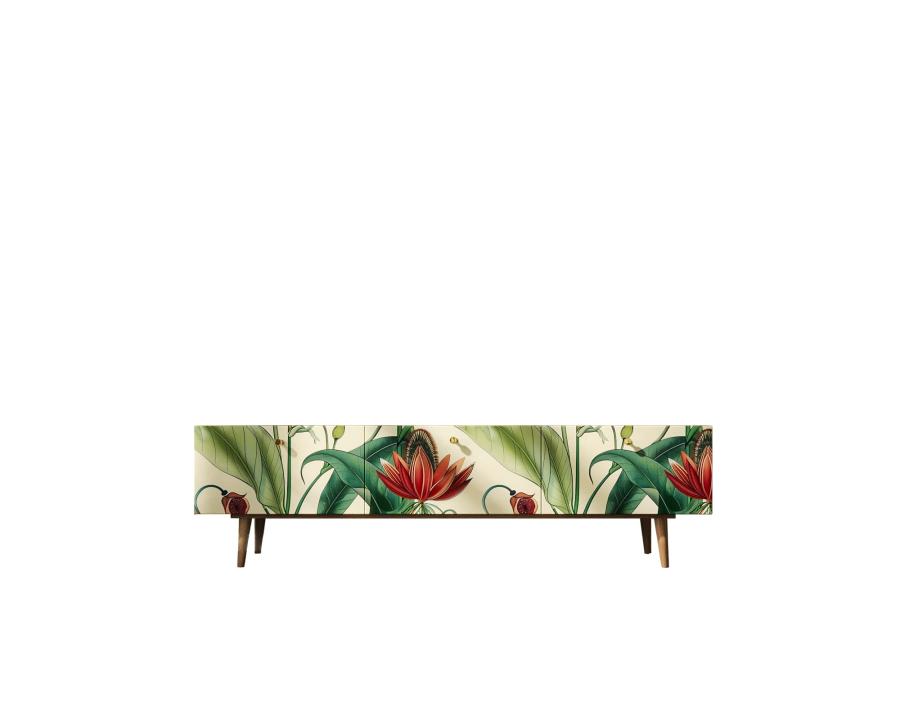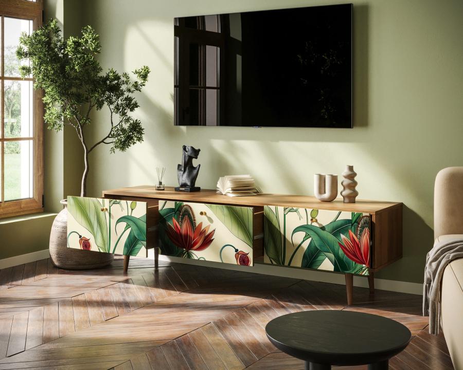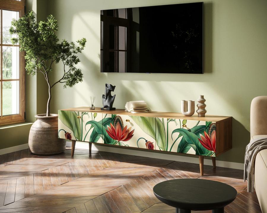Комод под TV "Berber" имеет три глубоких и вместительных ящика на шариковых направляющих. Ширина комода 180 см, что позволяет достаточно эстетично смотреться с широкоформатными телевизорами. Яркий принт сделает комод акцентом любого интерьера.