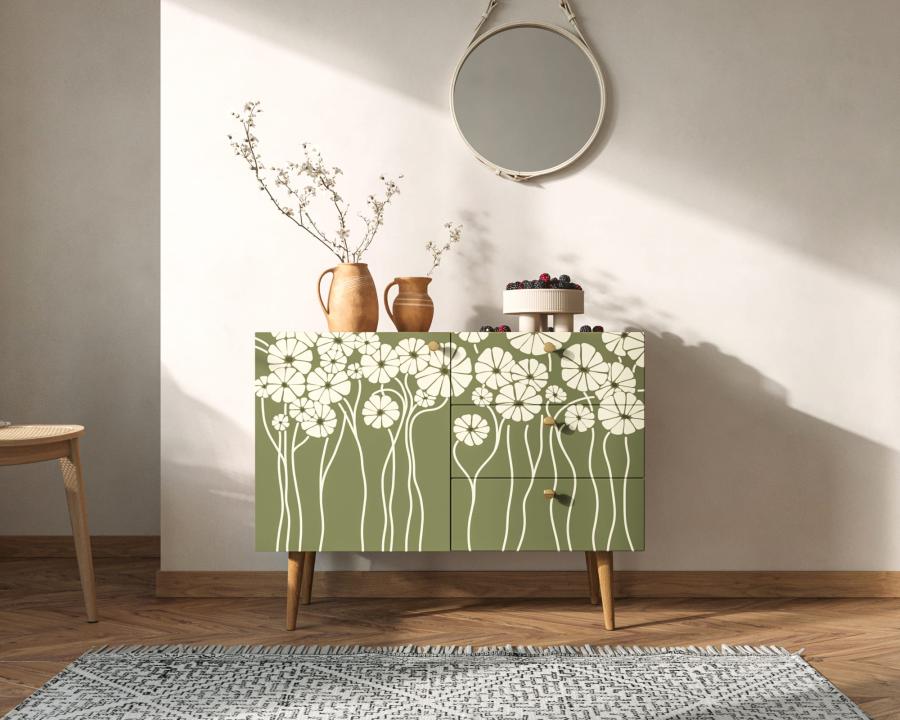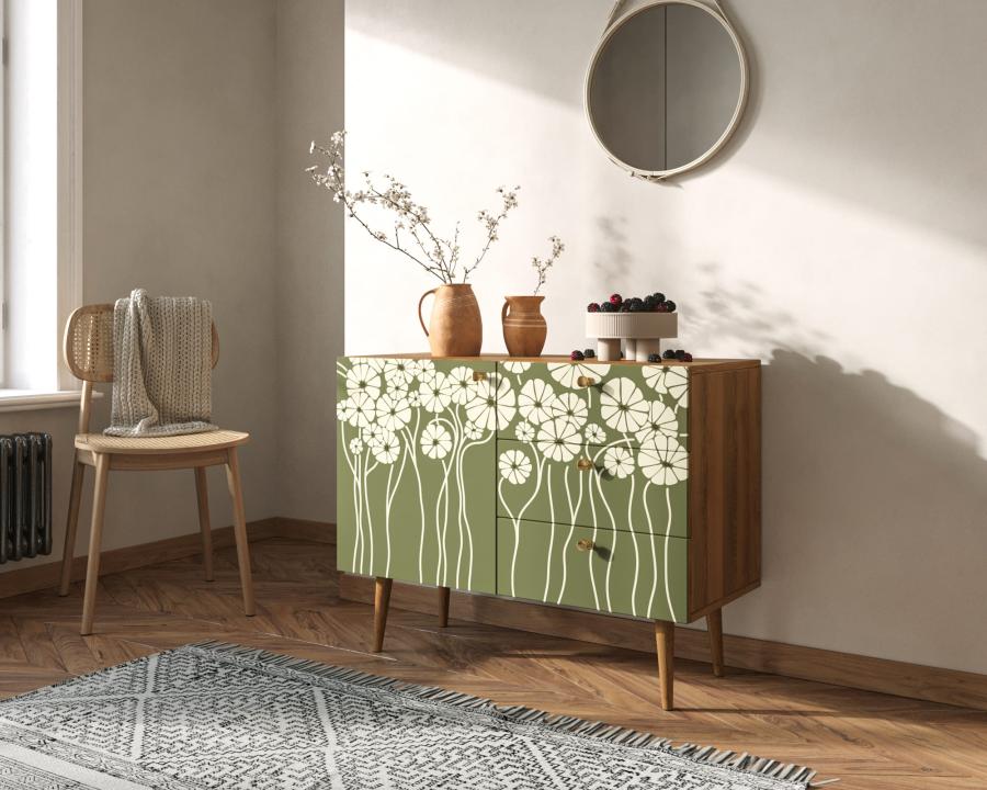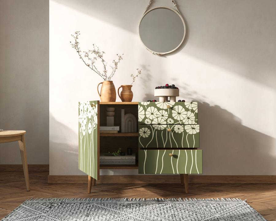 В компактном комоде три ящика и полка в левой секции за дверкой. Фасад украшает принт в спокойных тонах. Петли на дверях с доводчиком, ящики на шариковых направляющих. Для изготовления модели применены два вида материалов: ЛДСП для корпуса и массив ясеня для ножек.