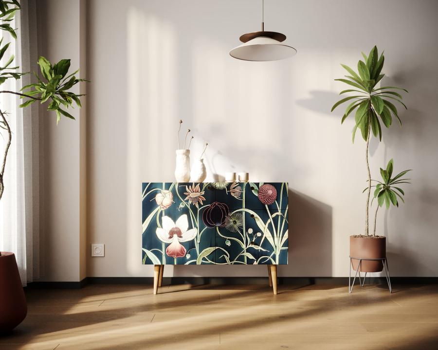 В компактном комоде три ящика и полка в левой секции за дверкой. Фасад украшает принт в спокойных тонах. Петли на дверях с доводчиком, ящики на шариковых направляющих. Для изготовления модели применены два вида материалов: ЛДСП для корпуса и массив ясеня для ножек.