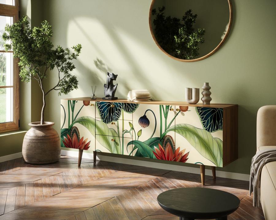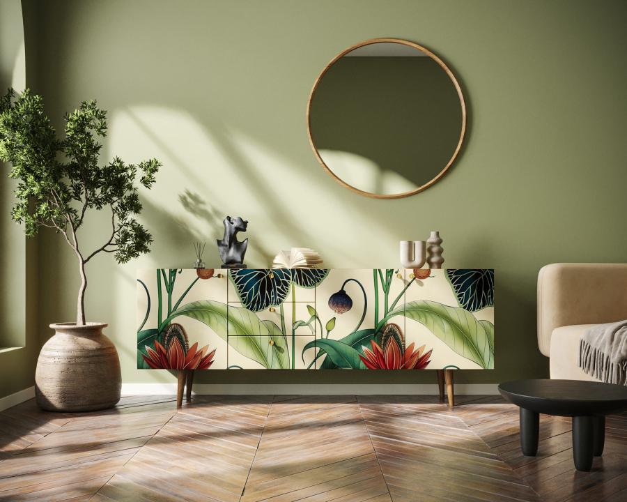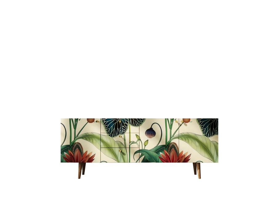Комод "Berber" удлиненный принт 7. Удлиненный комод "Berber" снабжен тремя небольшими ящиками, а за дверцами пространство разделено полкой. Комод функционален и может служить тумбой под TV, дополнением к дивану в гостиной, который зонирует пространство комнаты или быть самостоятельным арт-объектом.