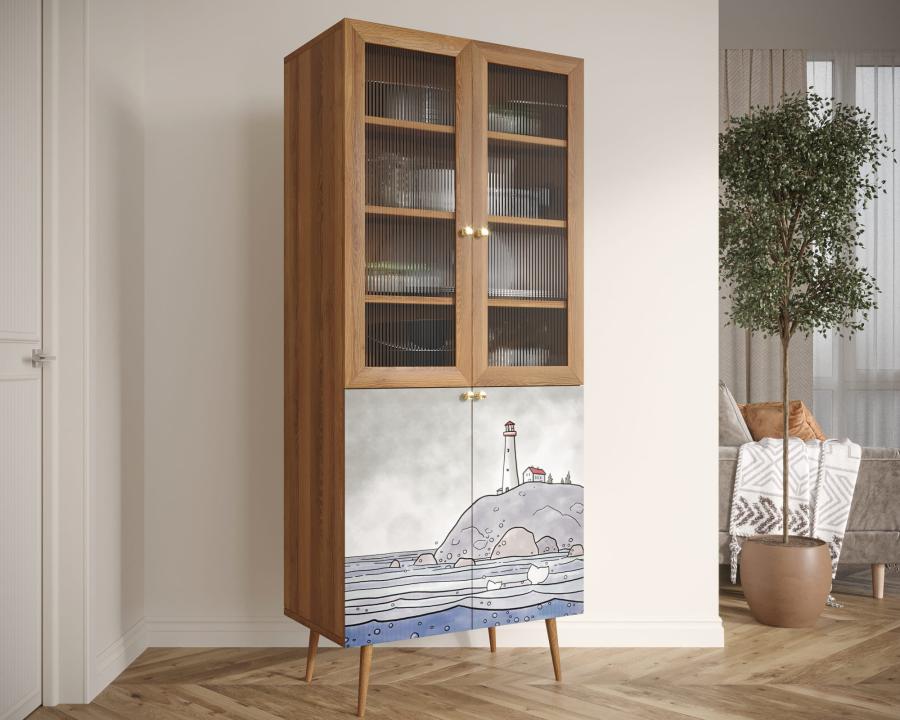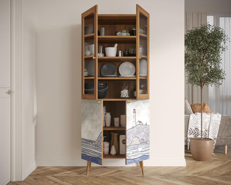 Малый буфет "Berber" имеет верхнее отделение с рифлеными дверками в раме из натурального ясеня и нижнее, дверки которого покрыты дизайнерским принтом. Пространство за дверками поделено на несколько секций, в каждой из которой есть съемные полки регулируемые по высоте в трех режимах.