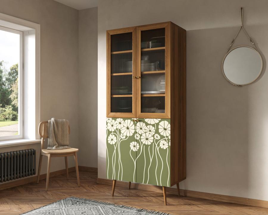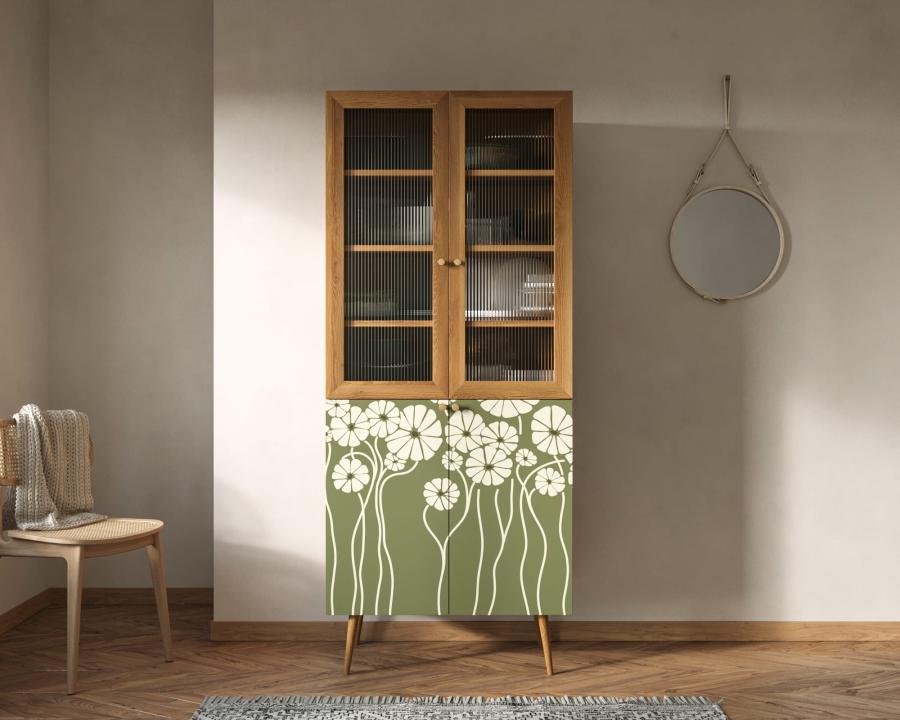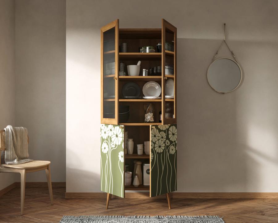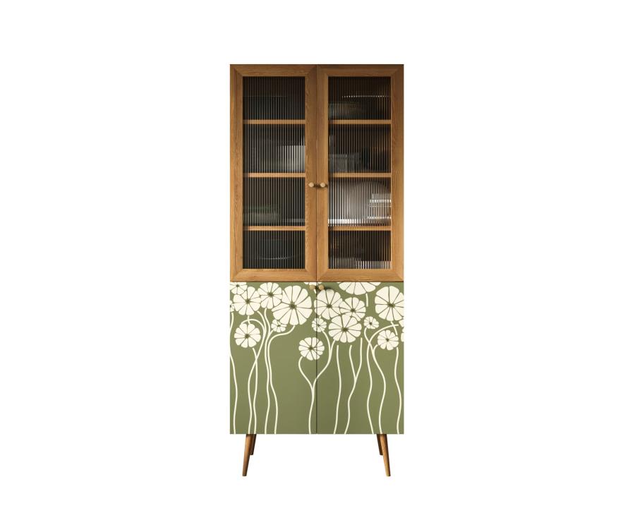 Малый буфет "Berber" имеет верхнее отделение с рифлеными дверками в раме из натурального ясеня и нижнее, дверки которого покрыты дизайнерским принтом. Пространство за дверками поделено на несколько секций, в каждой из которой есть съемные полки регулируемые по высоте в трех режимах.