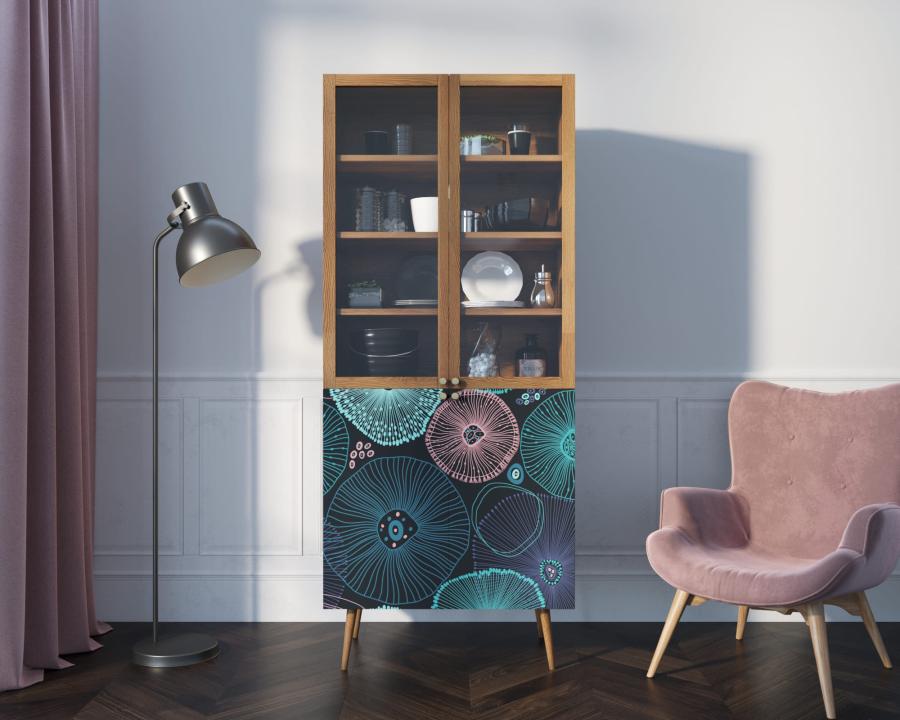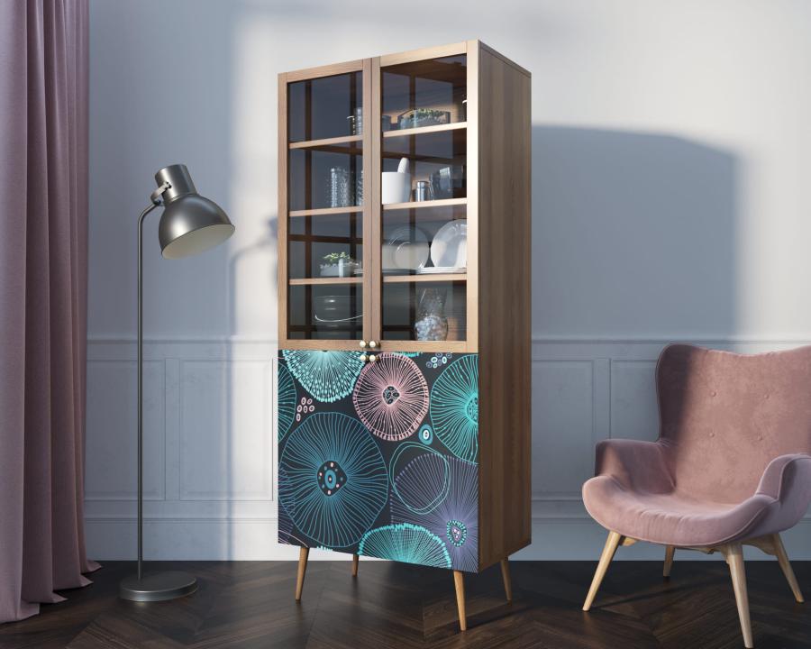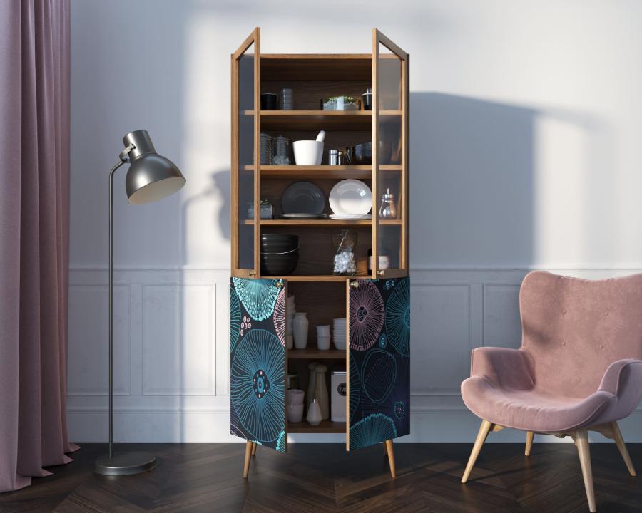 Малый буфет "Berber" имеет верхнее отделение с рифлеными дверками в раме из натурального ясеня и нижнее, дверки которого покрыты дизайнерским принтом. Пространство за дверками поделено на две секции, в каждой из которой есть съемная полка регулируемая по высоте в трех режимах.