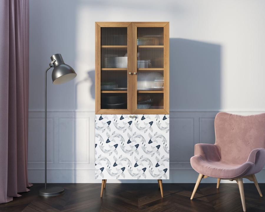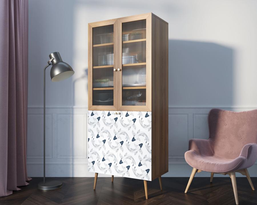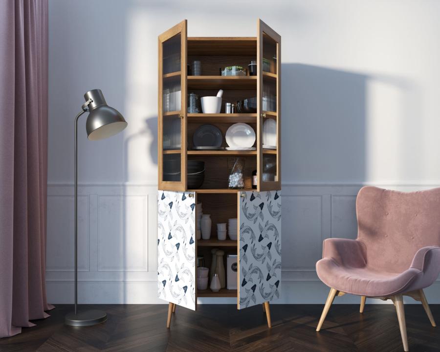 Малый буфет "Berber" имеет верхнее отделение с рифлеными дверками в раме из натурального ясеня и нижнее, дверки которого покрыты дизайнерским принтом. Пространство за дверками поделено на две секции, в каждой из которой есть съемная полка регулируемая по высоте в трех режимах.