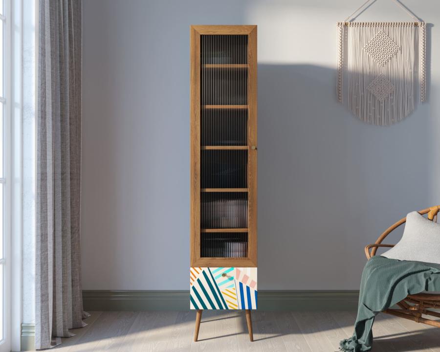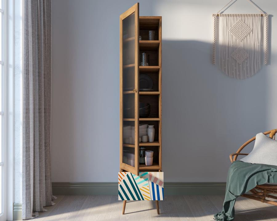 Элегантный буфет станет привлекательным и функциональным дополнением для интерьера гостиной, столовой или кухни. Модель выполнена в простом стиле с добавлением интересных декоративных деталей. Спокойный дизайн буфета оживляет красочный фасад выдвижного ящика, который украшен дизайнерским принтом.
