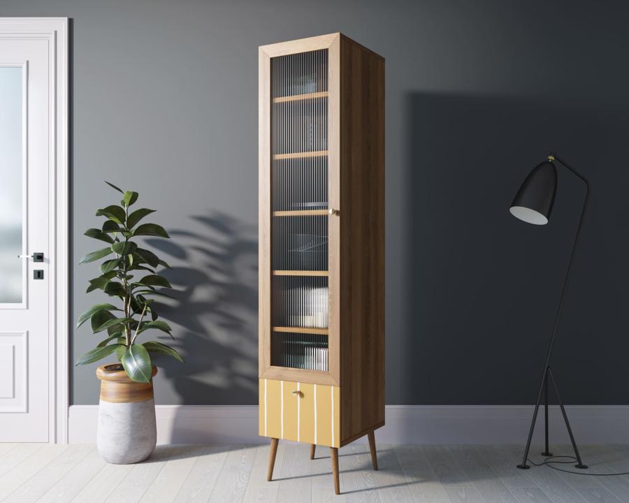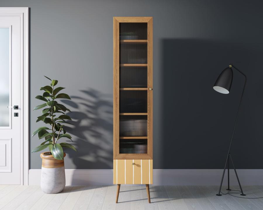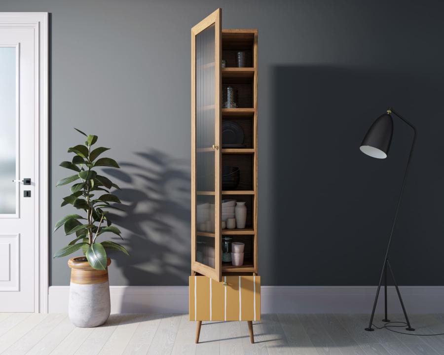 Узкий, но высокий буфет вмещает 6 полок, скрытых за прозрачным рифленым стеклом цельной дверцы, а также нижний выдвижной ящик с ярким желто-белым принтом. Каркас, собранный из ЛДСП, удерживают ножки из массива ясеня. Стильный комод дополнит гарнитур из аналогичной серии и идеально впишется в помещения в стиле кантри, авангард или скандинавском.