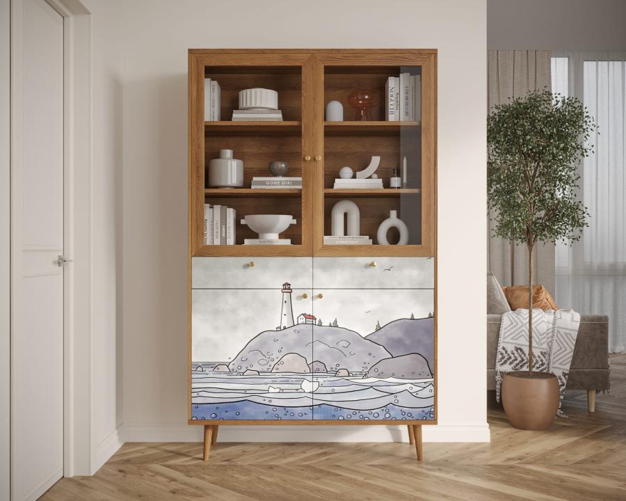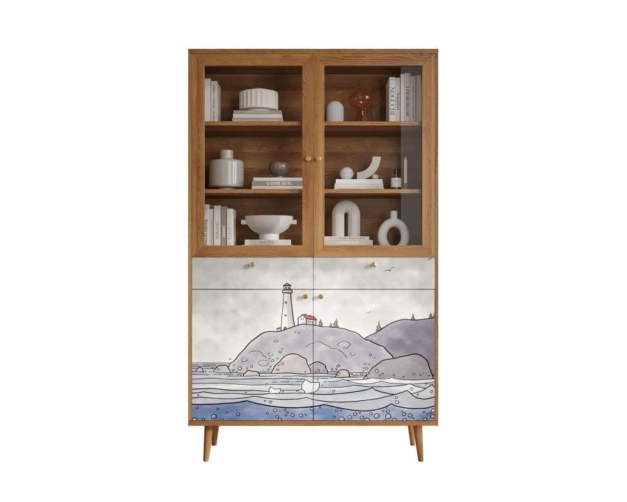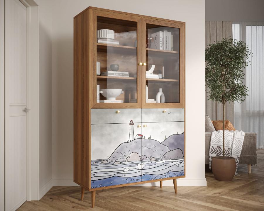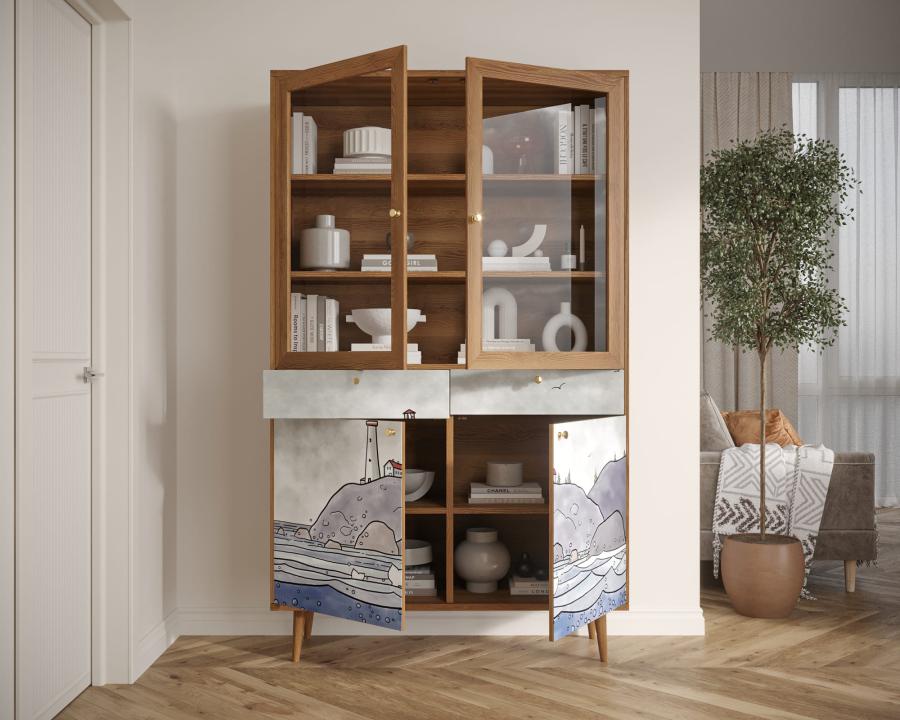 Буфет "Berber" имеет два выдвижных ящика на шариковых направляющих (могут быть заменены на доводчики по желанию). Низ буфета разделен на две секции, которые скрываются за двумя дверками, и полкой. Верхняя часть закрывается стеклянными дверцами, а на двух полках отлично расположится декор или кухонная утварь.