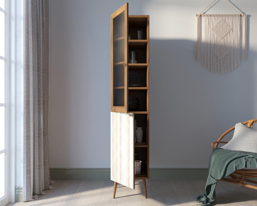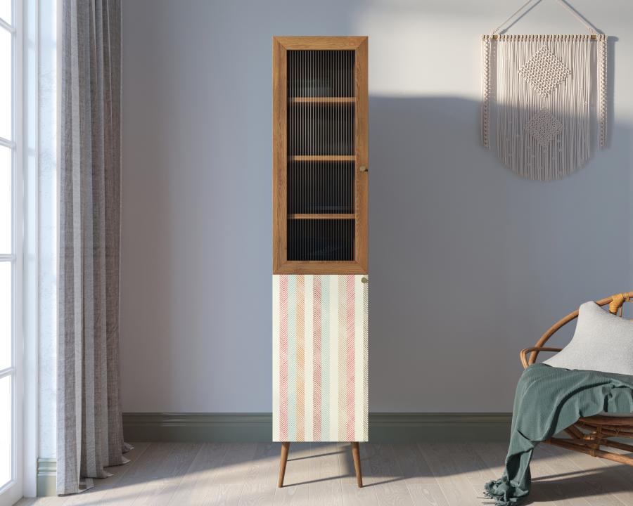 Узкий комод "Berber” (принт 45) оснащен двумя дверцами: сверху она стеклянная с рамой из массива дерева, снизу — выполнена из ЛДСП и украшена стильным принтом в скандинавском стиле. Благодаря уникальной технологии нанесения рисунка он не выгорит и не сотрется даже спустя десятки лет. Хотя комод "Berber” узкий (всего 40 см), из-за достаточно большой высоты (190 см) он позволяет вместить все нужные вещи: продукты, текстиль, посуду, декор. Дверцы оснащены качественными петлями с доводчиками, что защитит от порчи мебели при закрывании. Ножки выполнены из массива ясеня.