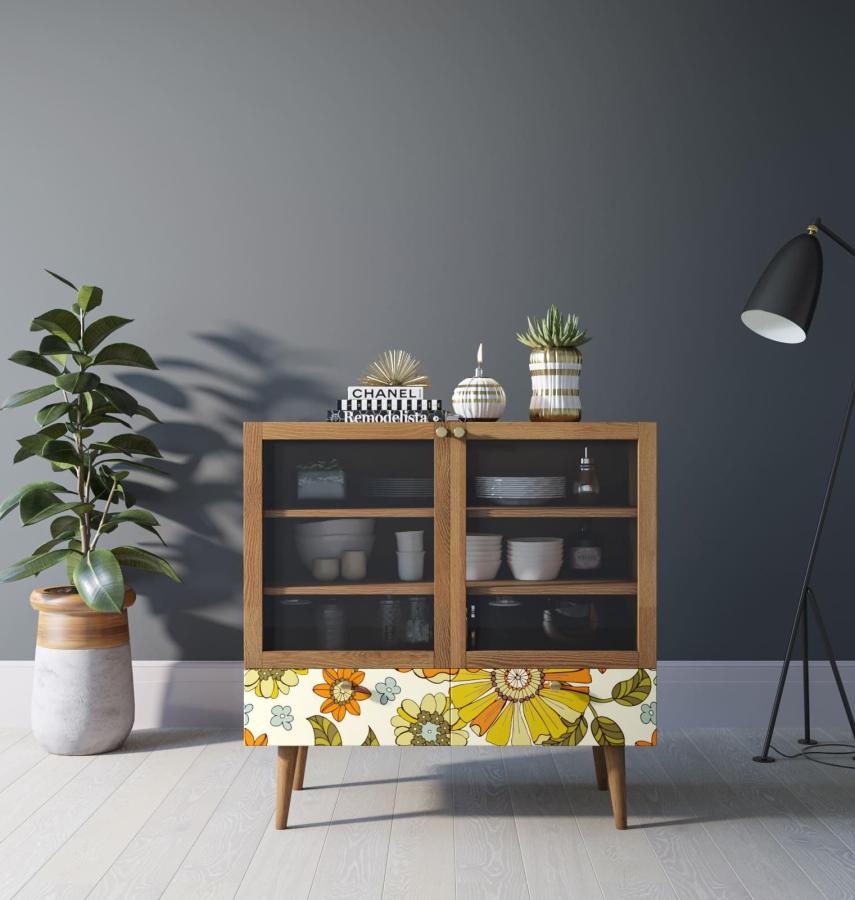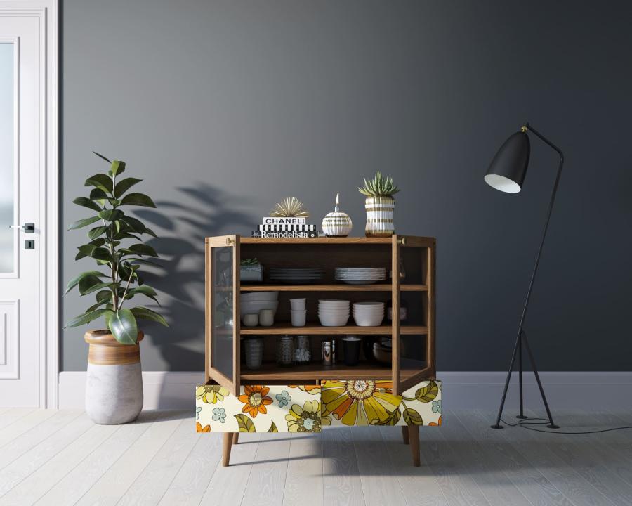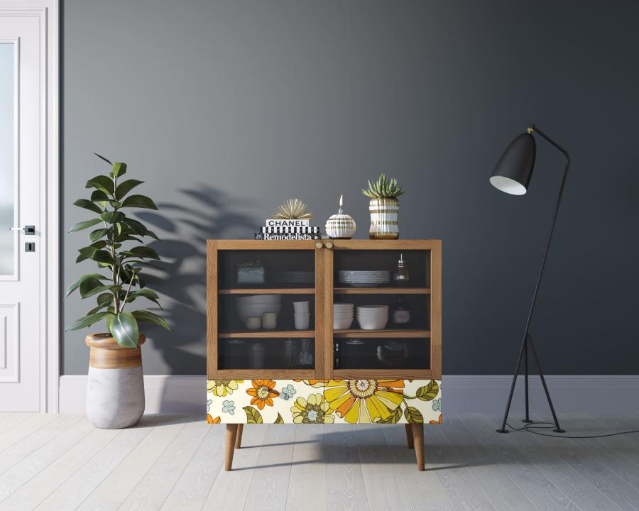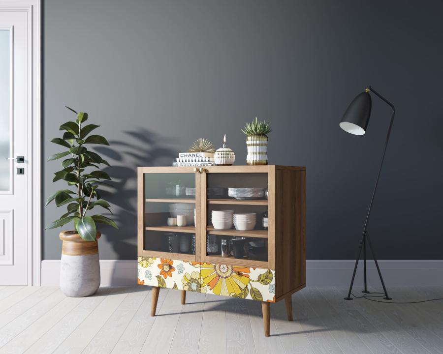 Изящный невысокий комод выглядит компактно и не громоздко. Внутри за стеклянными створками размещаются три удобных полки для кухонной утвари. Снизу конструкцию украшают два выдвижных ящика с ярким цветочным принтом. Такой комод вдохнет свежесть и хорошее настроение в помещения, оформленные в стилях скандинавский, кантри, прованс, этно, авангард..