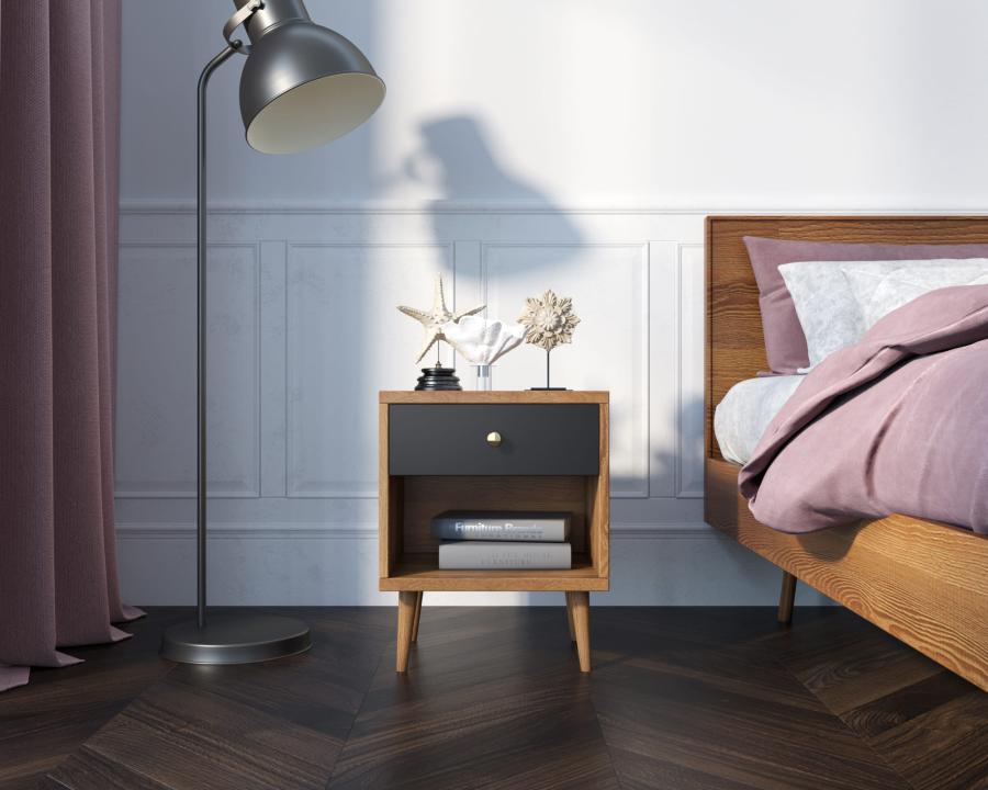 Прикроватная тумбочка строгой геометрической формы. Изготовлена на основе ЛДСП, снабжена длинными, прочными ножками из массива ясеня. Практичная, вместительная модель имеет открытую глубокую полку и один ящик темного контрастного оттенка.
