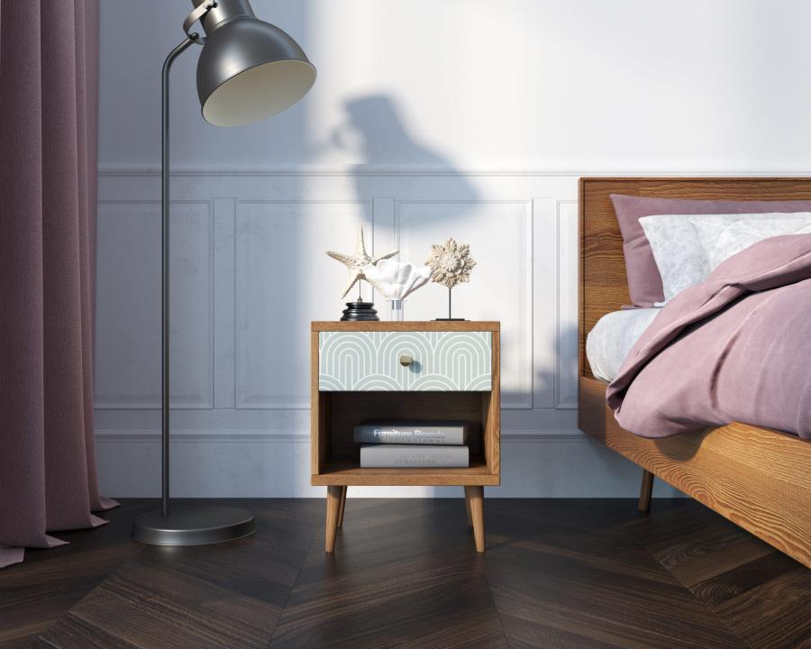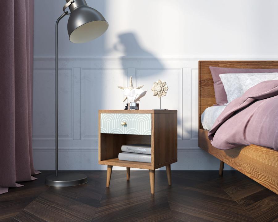 Тумба отличается компактными габаритами. Она представлена прямоугольным корпусом, изготовленным из ЛДСП, и высокими ножками, выполненных из натурального дерева. В модели имеется один ящик с нежным орнаментом на лицевой стороне и открытая вместительная полка.