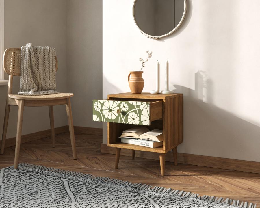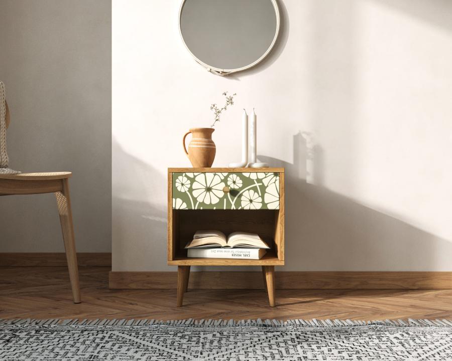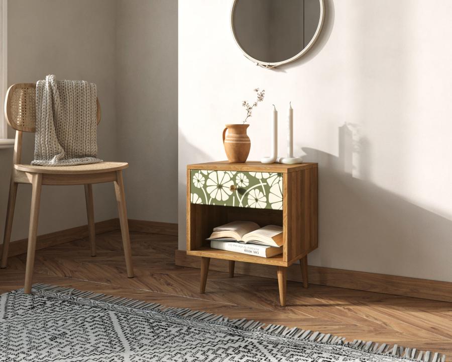 В компактной тумбочке присутствует продольный ящик с принтом и полка открытого вида. Конструкция представлена в геометрических формах. Для изготовления модели применены два вида материалов: ЛДСП для корпуса и массив ясеня для ножек.