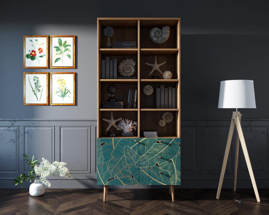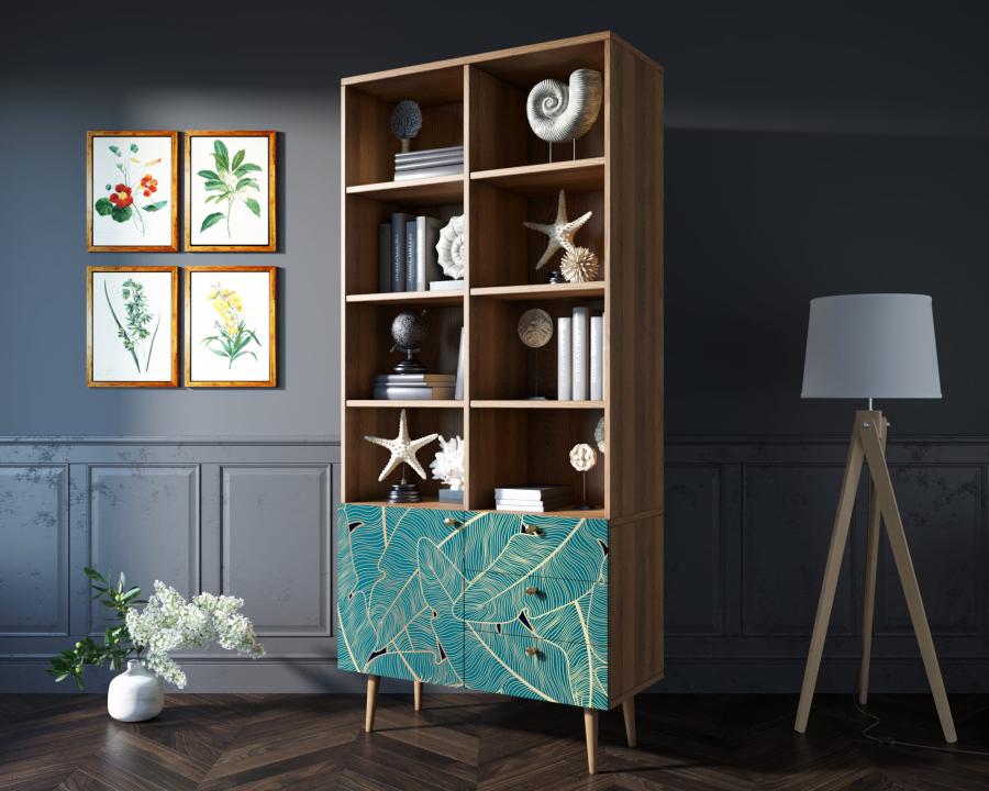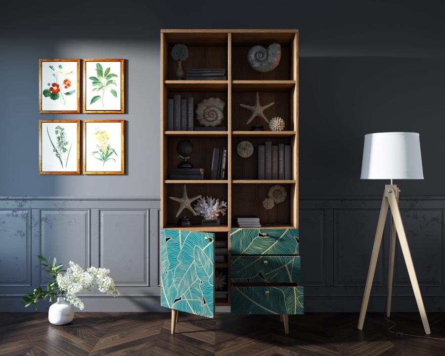 Стеллаж с дизайнерским принтом на фасаде имеет три небольших ящика полного выдвижения на шариковых направляющих. Левая секция за дверкой разделена полкой, которая регулируется по высоте. Ноги изготовлены из прочного массива ясеня.