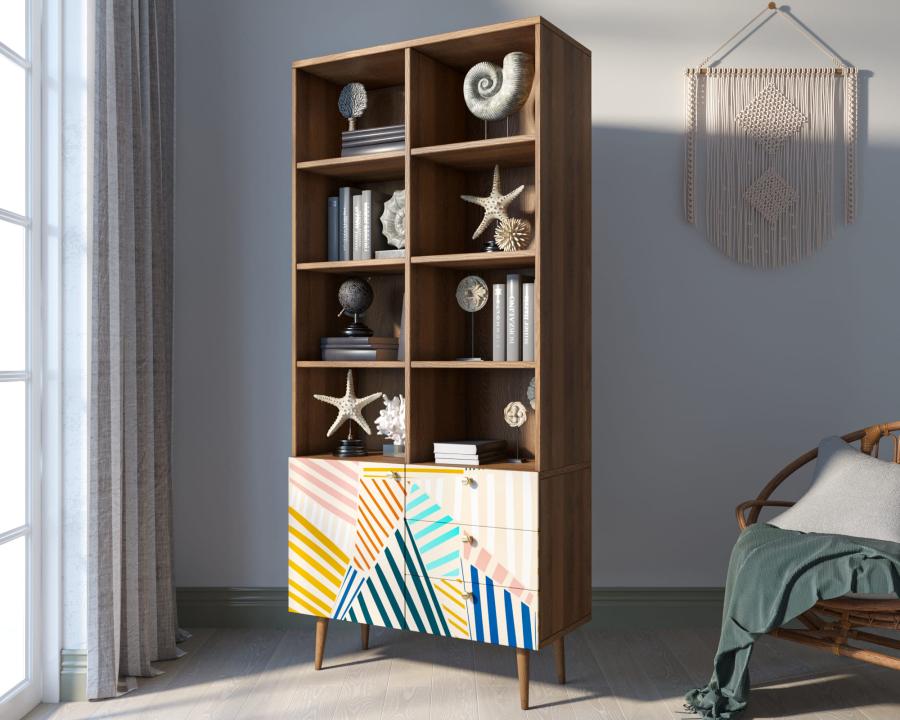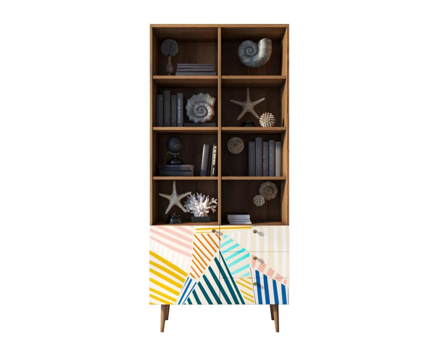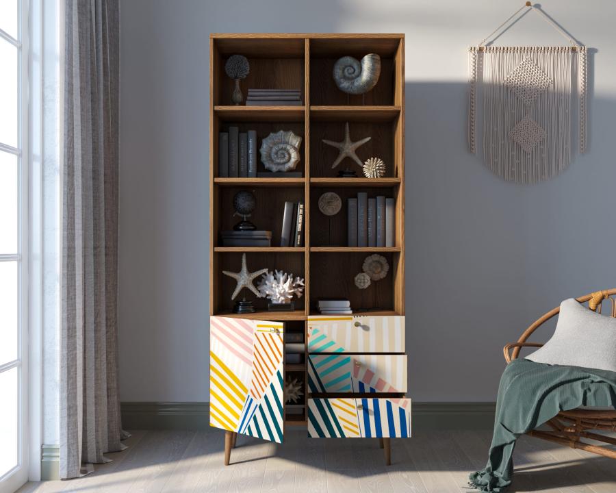 Стеллаж с дизайнерским принтом на фасаде имеет три небольших ящика полного выдвижения на шариковых направляющих. Левая секция за дверкой разделена полкой, которая регулируется по высоте. Ноги изготовлены из прочного массива ясеня.