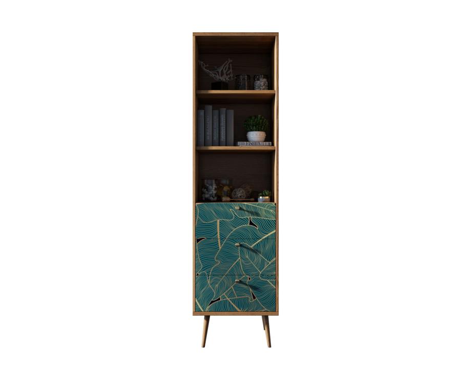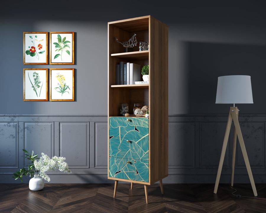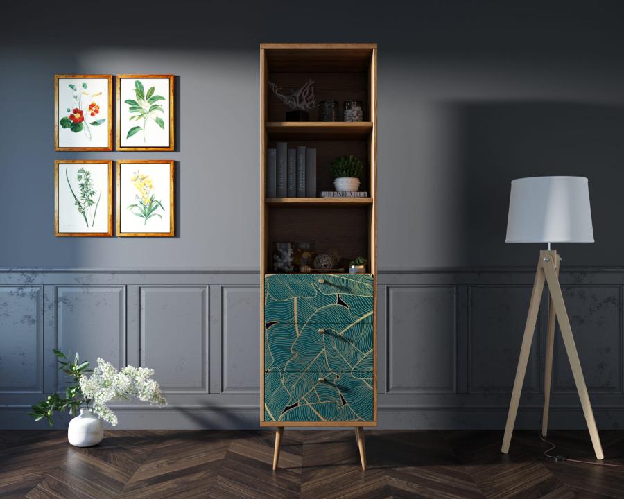 Узкий стеллаж Berber имеет три ящика полного выдвижения на шариковых телескопических направляющих. Фасад украшен принтом выполненный в спокойных тонах. Ножки изготовлены из прочного массива ясеня.