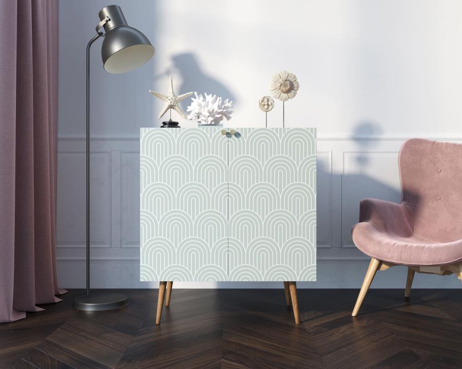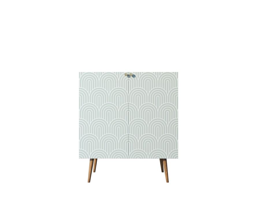 Компактная модель комода скрывает за дверками нишу, разделенную на две части полкой регулируемой по высоте. Корпус прямоугольной формы, а ножки изготовлены из прочного массива ясеня. Комод привлекает внимание спокойным принтом на фасаде.