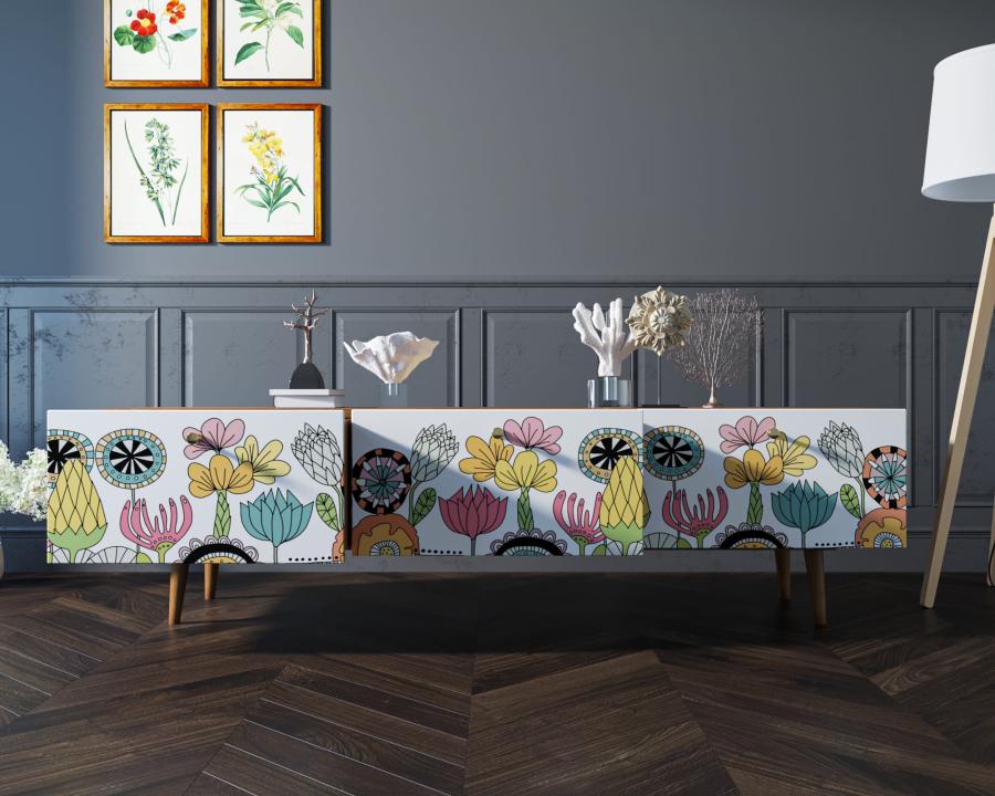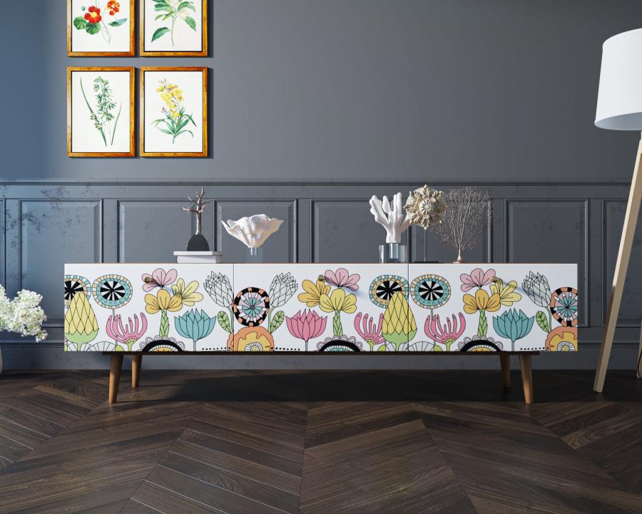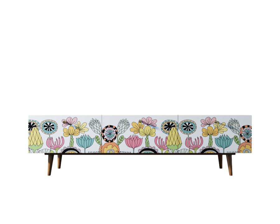 Комод под TV "Berber" имеет три глубоких и вместительных ящика на шариковых направляющих. Ширина комода 180 см, что позволяет достаточно эстетично смотреться с широкоформатными телевизорами. Яркий принт сделает комод акцентом любого интерьера.