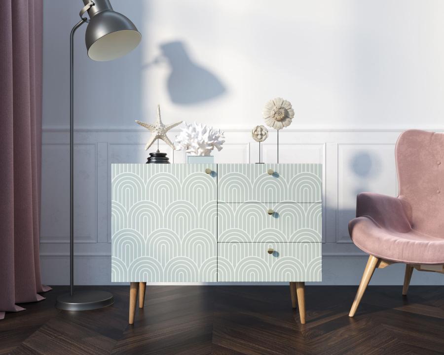 В компактном комоде три ящика и полка в левой секции за дверкой. Фасад украшает принт в спокойных тонах. Петли на дверях с доводчиком, ящики на шариковых направляющих. Для изготовления модели применены два вида материалов: ЛДСП для корпуса и массив ясеня для ножек.