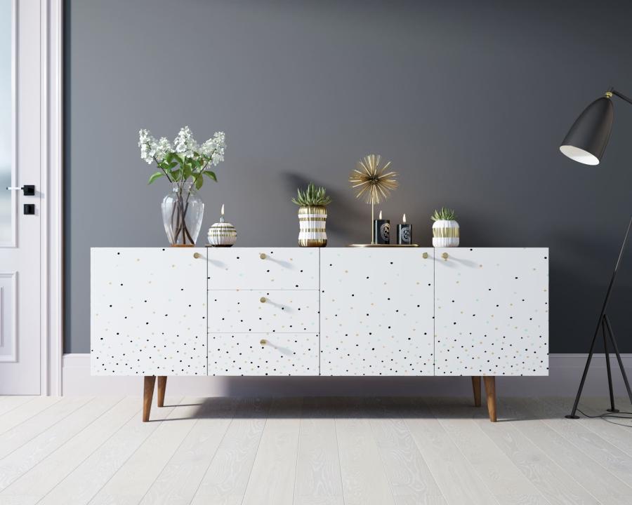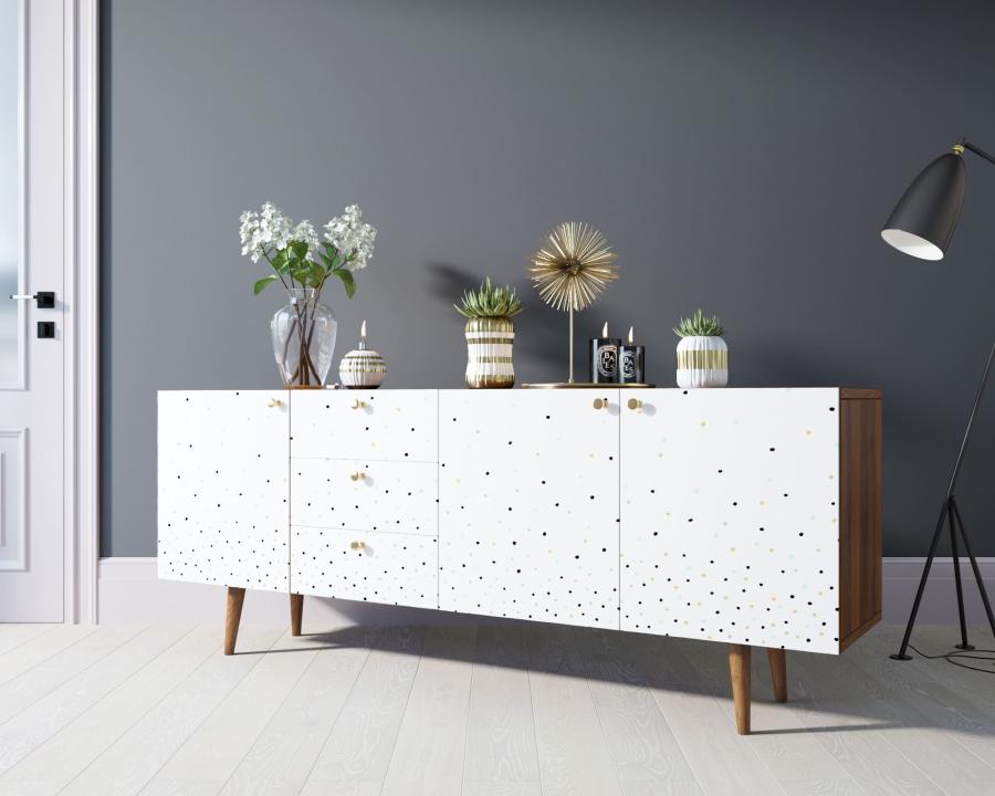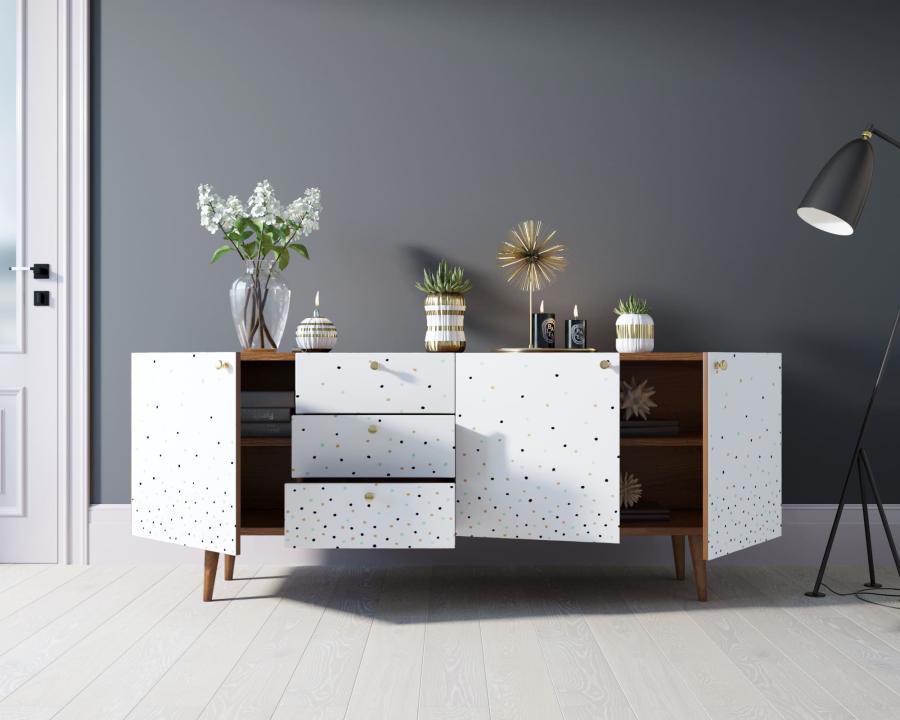 Комод "Berber" удлиненный принт 15. Удлиненный комод "Berber" снабжен тремя небольшими ящиками, а за дверцами пространство разделено полкой. Комод функционален и может служить тумбой под TV, дополнением к дивану в гостиной, который зонирует пространство комнаты или быть самостоятельным арт-объектом.