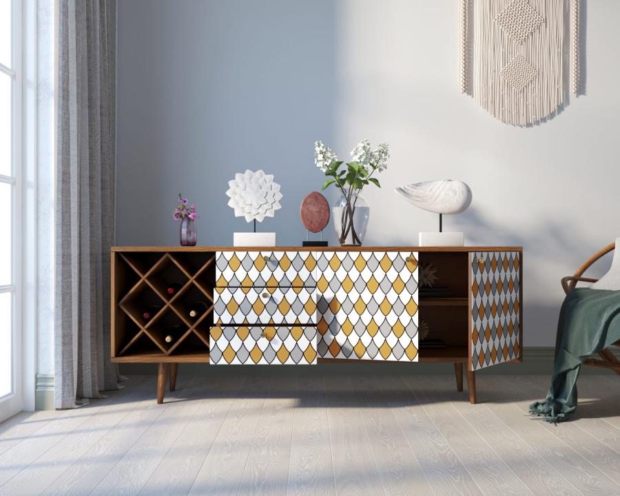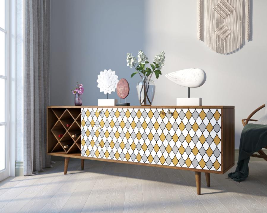 Комод "Berber" удлиненный с бутылочницей 22 принт. Удлиненный комод "Berber" снабжен бутылочницей, тремя небольшими ящиками, а за дверцами пространство разделено полкой. Комод функционален и может служить тумбой под TV, дополнением к дивану в гостиной, который зонирует пространство комнаты или быть самостоятельным арт-объектом.