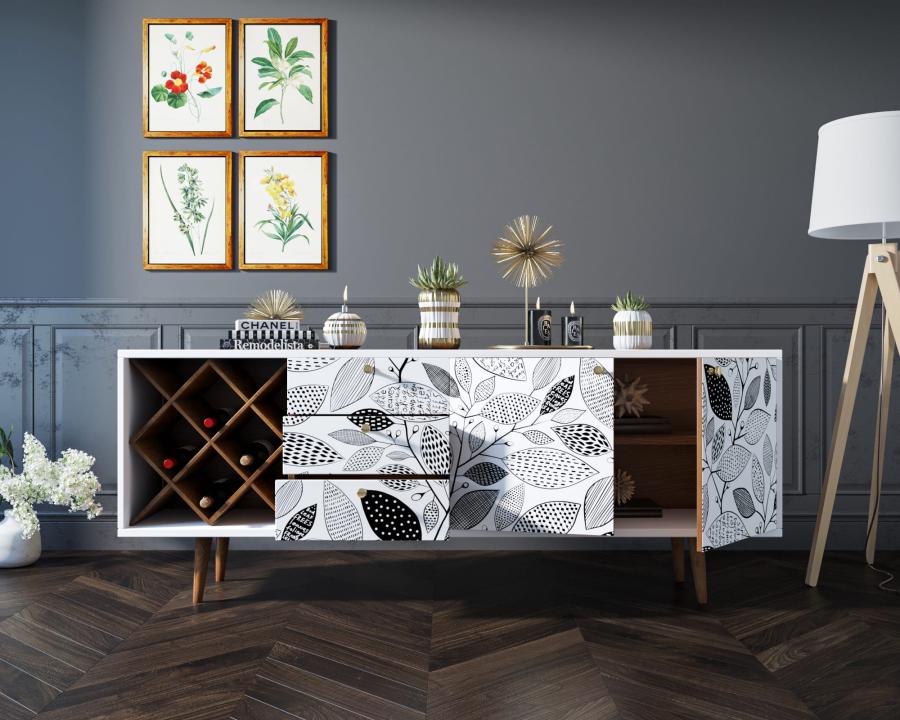 Комод "Berber" удлиненный с бутылочницей 9 принт. Удлиненный комод "Berber" снабжен бутылочницей, тремя небольшими ящиками, а за дверцами пространство разделено полкой. Комод функционален и может служить тумбой под TV, дополнением к дивану в гостиной, который зонирует пространство комнаты или быть самостоятельным арт-объектом.