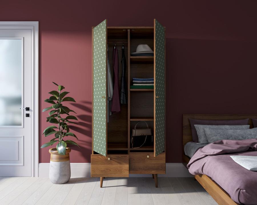 Двухстворчатый шкафы "Berber" имеет два глубоких, выдвижных ящика на шариковых направляющих и два отделения за дверками. Слева за дверью располагается съемная штанга, а справа три полки. Шкаф достаточно функционален и не займет много места, ведь ширина всего 90 см. Можно разместить в спальне или прихожей.
