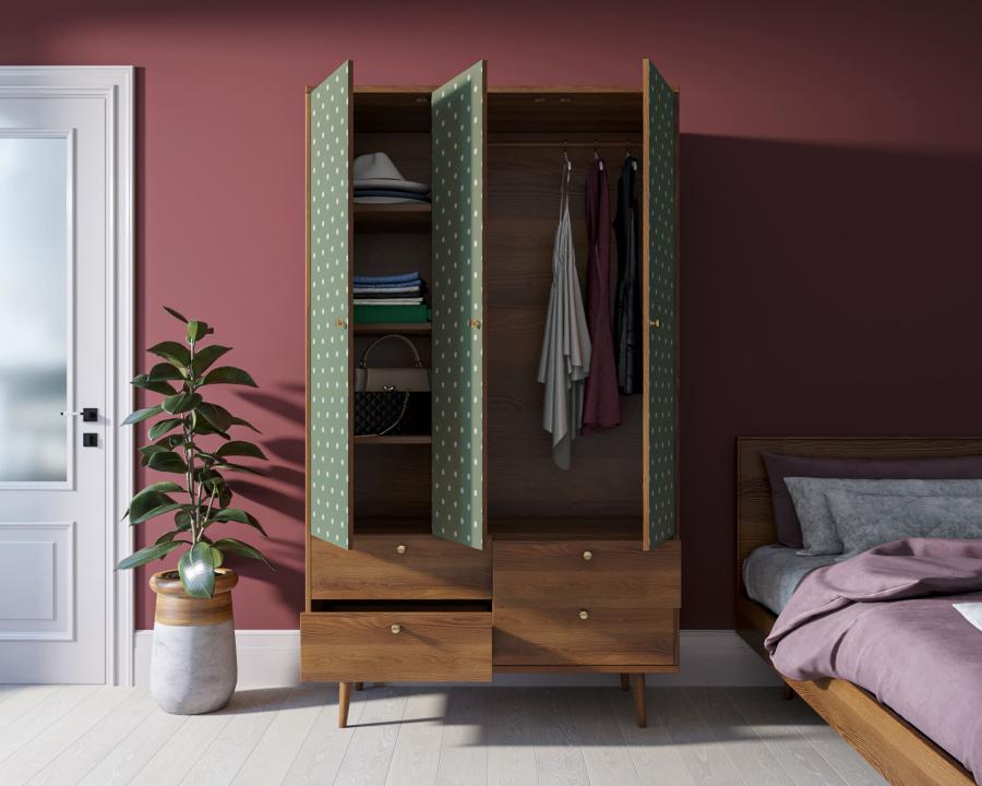 Трехстворчатый шкаф "Berber" имеет четыре вместительных, выдвижных ящика на шариковых направляющих и два больших отделения за дверками. Слева за дверкой располагаются три полки, а справа отделение со съемной штангой. Шкаф достаточно функционален и при своих компактных размерах, в ширину всего 115 см, способен вместить достаточное количество вещей.