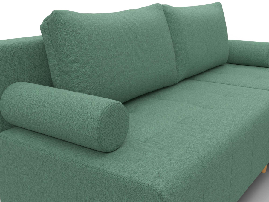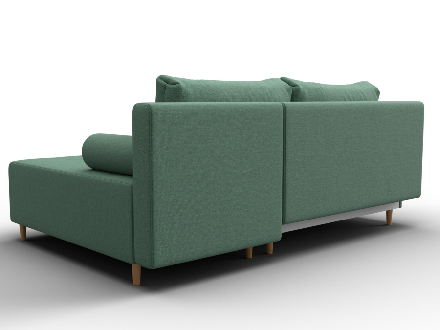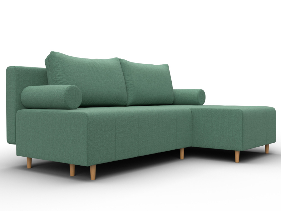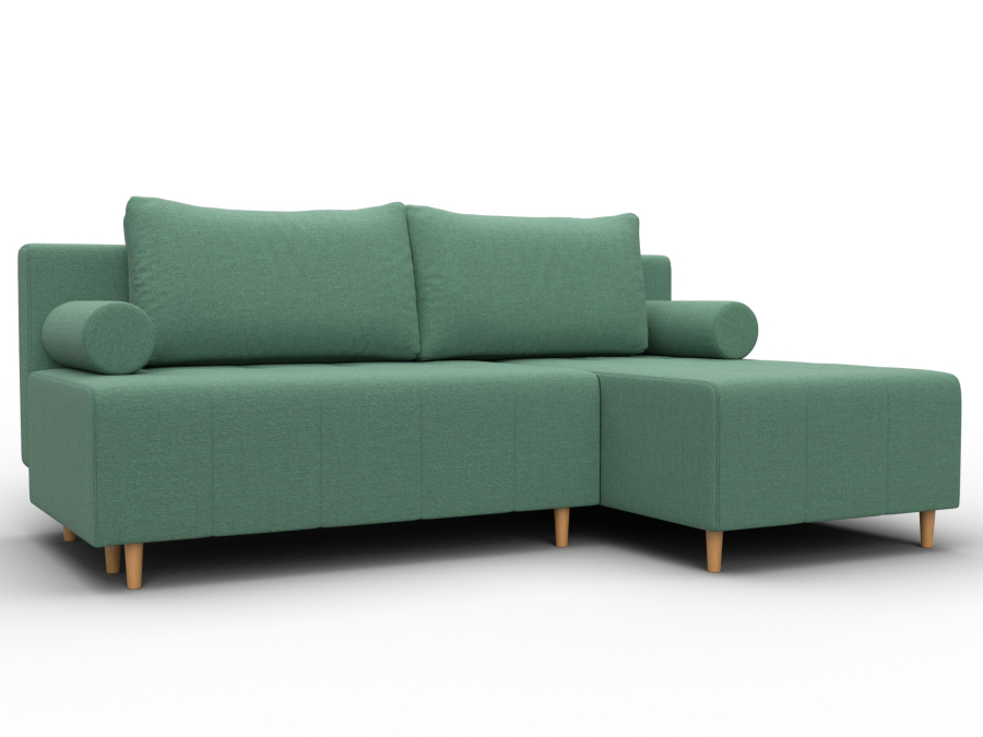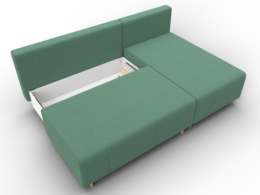 Лига-102 – угловой диван со спальным местом без подлокотников. Спинка дополнена двумя мягкими подушками. Уголовой диван может быть собран с углом с правой или левой стороны. Для хранения белья в конструкции предусмотрен ящик.