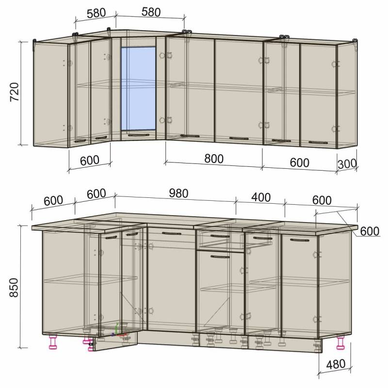 Высота напольных шкафов с учетом столешницы и ножек: 850 мм.