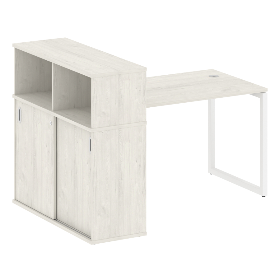 Столешницы имеют отверстия с пластиковыми заглушками кабель-канала серого цвета.