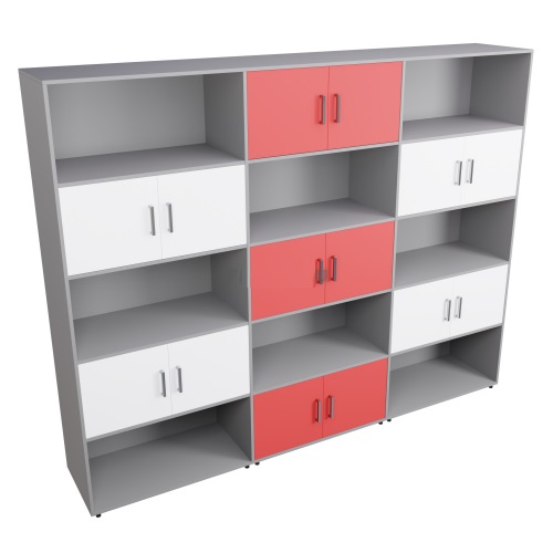 Шкаф содержит 15 полок, 7 полок закрыты глухими вкладными дверцами, задняя стенка из листа ДВП.