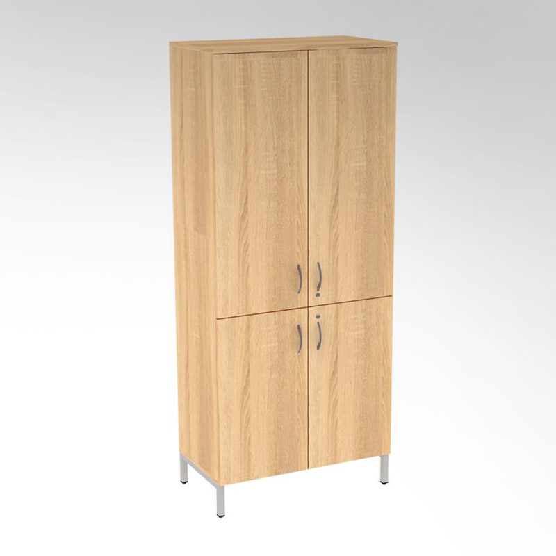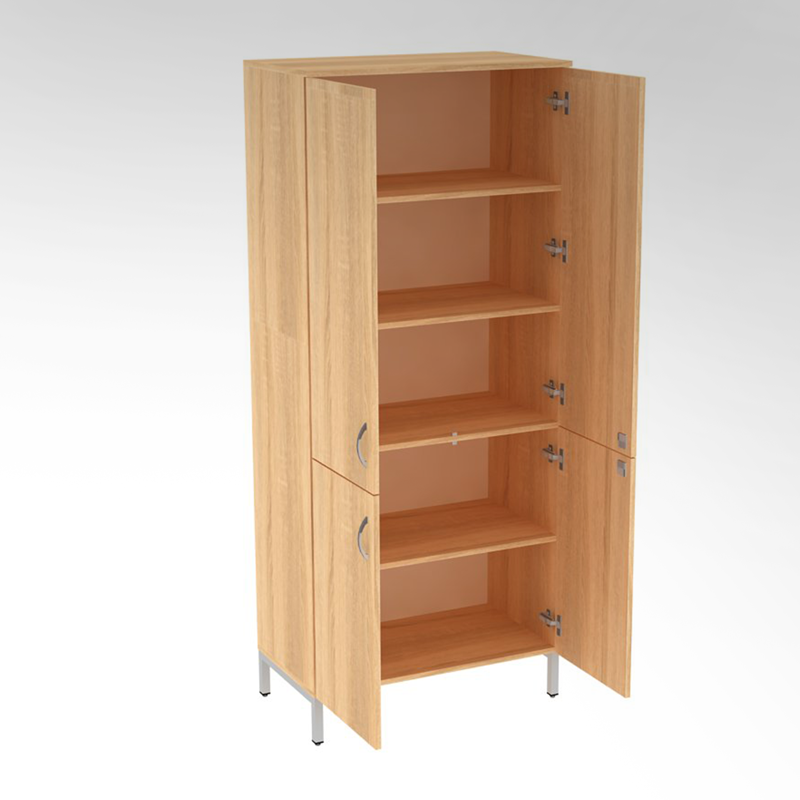 Имеет 4 распашных двери с замками, 4 полки, фурнитуру для крепления к стене и регулируемые опоры для компенсации неровностей пола, кромку из ПВХ.