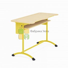 Стол оснащен двумя крючками для портфелей и ложементом для карандашей и ручек, полкой.