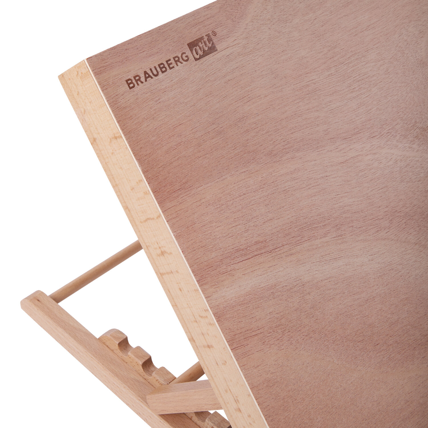 Настольный планшетный мольберт изготовлен из натурального бука, пропитанного маслом. Мольберт с регулируемым углом наклона отлично подходит для работы с малыми и средними форматами, максимальный размер бумаги - А3. Планшет мольберта представляет собой жесткую основу, за счет этого на мольберте легко можно закрепить бумагу малярным скотчем или зажимами. Поверхность планшета хорошо отшлифована и подходит даже для тонкой бумаги. 5 вариантов наклона мольберта помогут найти удобное положение для творчества. Мольберт удобно хранить в сложенном виде. Размер в разложенном виде - 47х36х31 см. Вес - 1,5 кг.Художественные мольберты пригодятся как канцтовары школьникам, студентам, участникам мастер-классов, ученикам художественных школ, студий и училищ, живописных мастерских, так как у них представлена широкая гамма размеров и видов. Можно найти вариант для работы дома или пленэре. С их помощью можно создать даже иллюстрации к сонетам Шекспира. Эти мольберты используют любители для хобби и профессионалы, которые стремятся достичь такой же славы как Пикассо (Picasso), Малевич, Шагал, Моне (Claude Monet), Рембрандт (Rembrandt), Дали (Salvador Dali), Уорхол (Andy Warhol), Рублёв, Фрида Кало (Frida Kahlo), Ван Гог (Vincent van Gogh), Тициан (Tician), Анри Матисс (Henri Matisse) Леонардо да Винчи (Leonardo da Vinci) и другие популярные художники и артисты. Творчество - луч света в серых буднях!