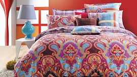 Компоненты, входящие в комплект: Наволочка:, 50x70+5, 2 шт, голубой, малиновый, 70x70+5, 2 шт, голубой, малиновый Пододеяльник:, 180x215, голубой, малиновый Простыня:, 200x220, голубой, малиновый.
