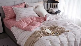 Компоненты, входящие в комплект: Наволочка:, 50х70, 1 шт, белый, розовый Пододеяльник:, 150х215, белый, розовый Простыня:, 150х215, белый, розовый.