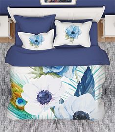 Компоненты, входящие в комплект: Наволочка:, 50x70, 2 шт, белый, синий, 70x70, 2 шт, синий Пододеяльник:, 160х220, белый, синий Простыня:, 150х200, синий.
