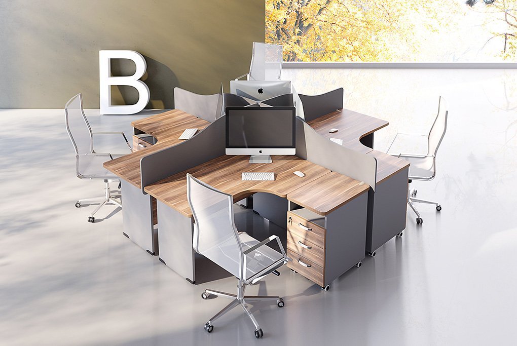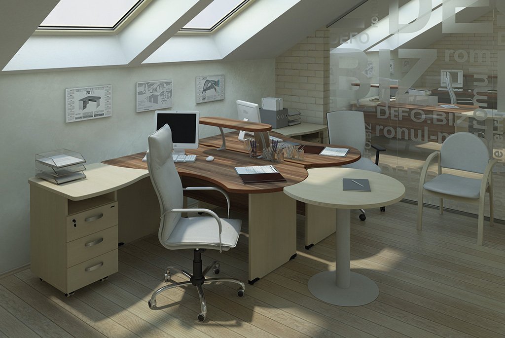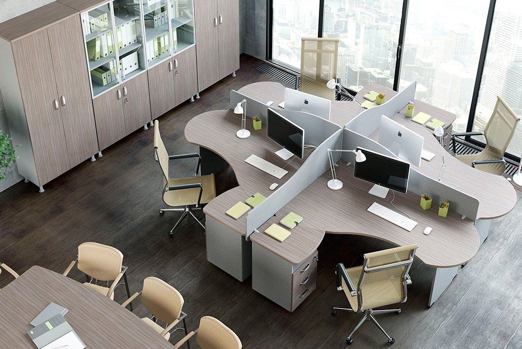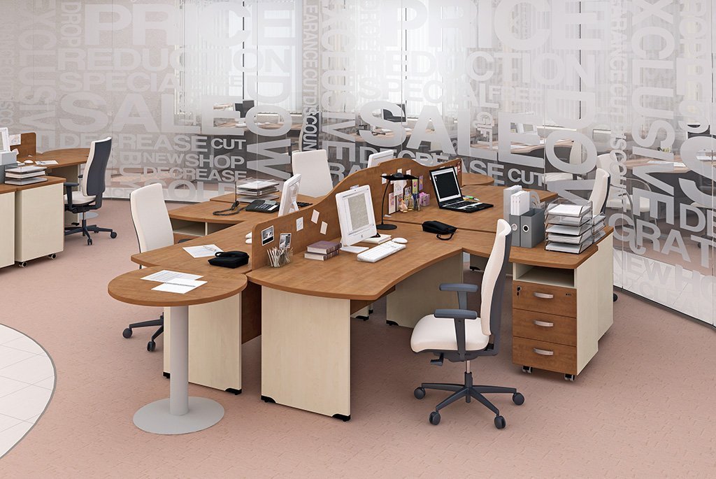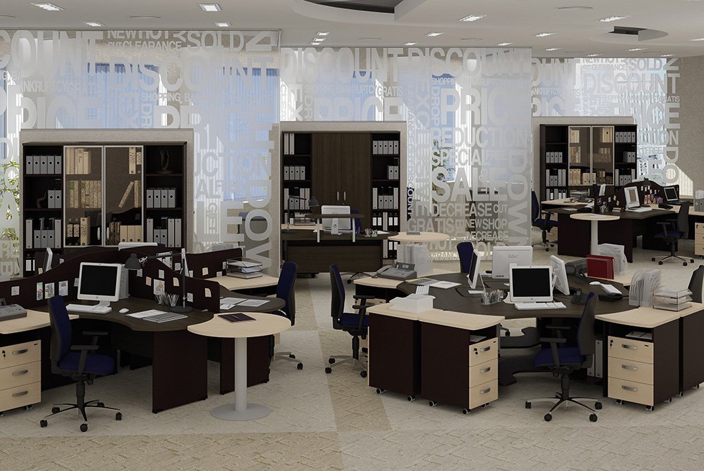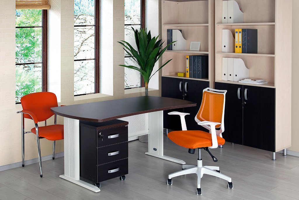 столы (рабочие, переговорные, приставные,журнальные), тумбы мобильные и приставные, стеллажи открытые и витринные, шкафы распашные для бумаг и гардеробы для офиса, а также дополнения — экраны, панели, брифинги и целую линейку ресепшн.